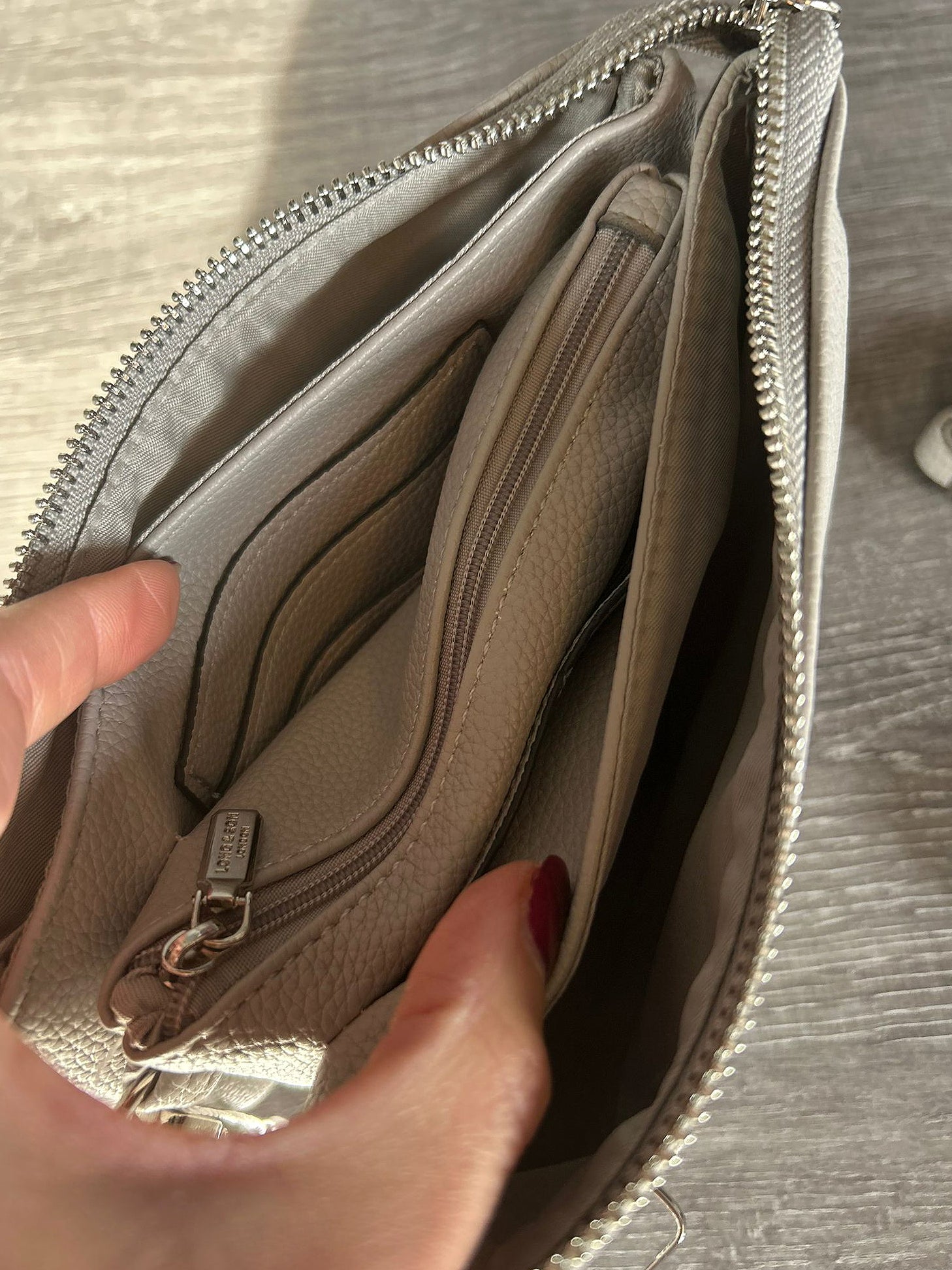 Soft faux leather. Clip zip closure. 3 primary compartments. Central zip closure. Internal card slots. Rear zip pocket. Removable wrist strap and a long adjustable strap. Approximately 20 x 14 cm.