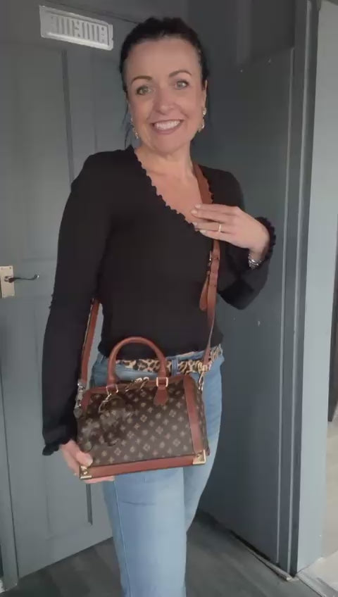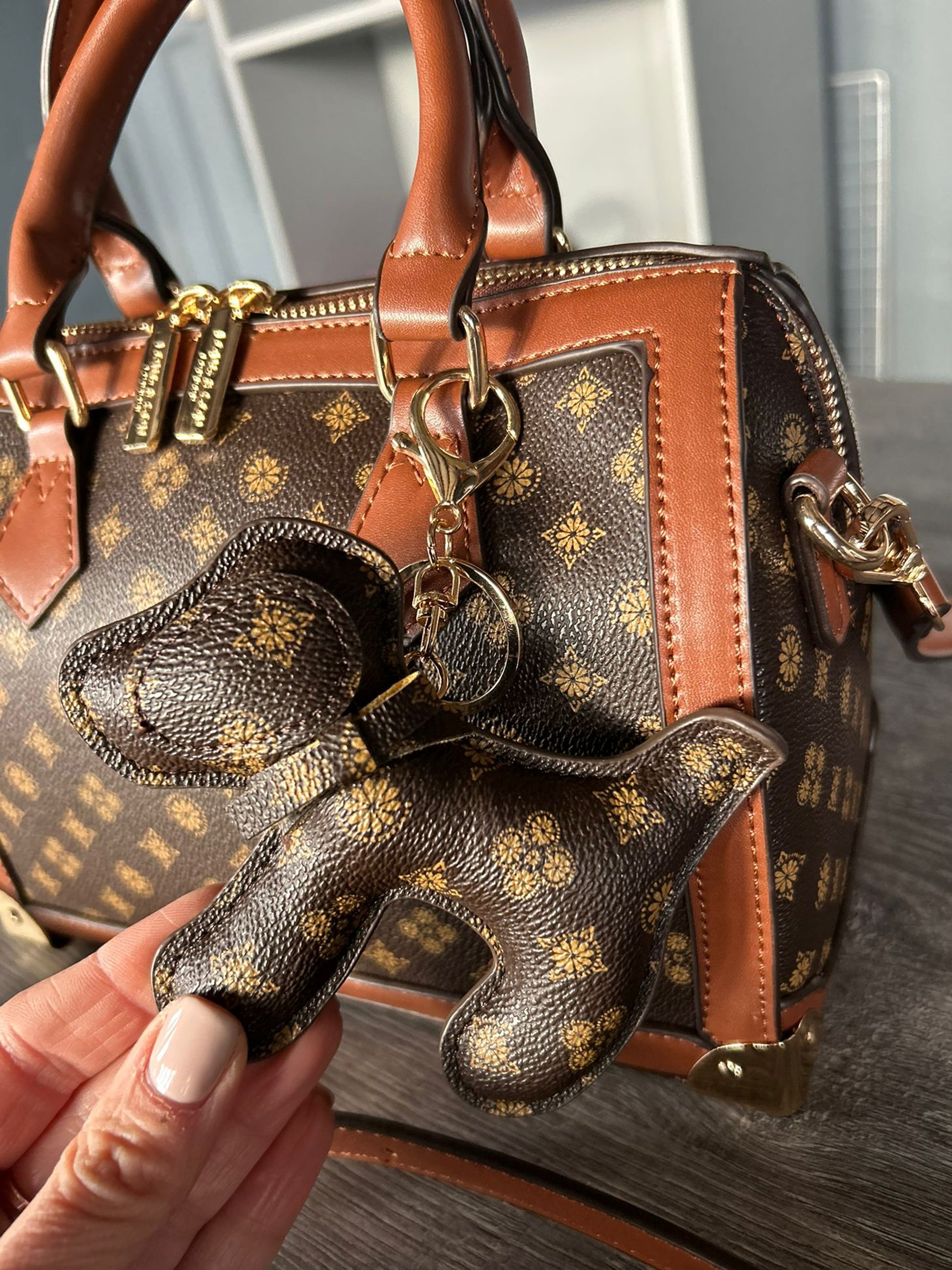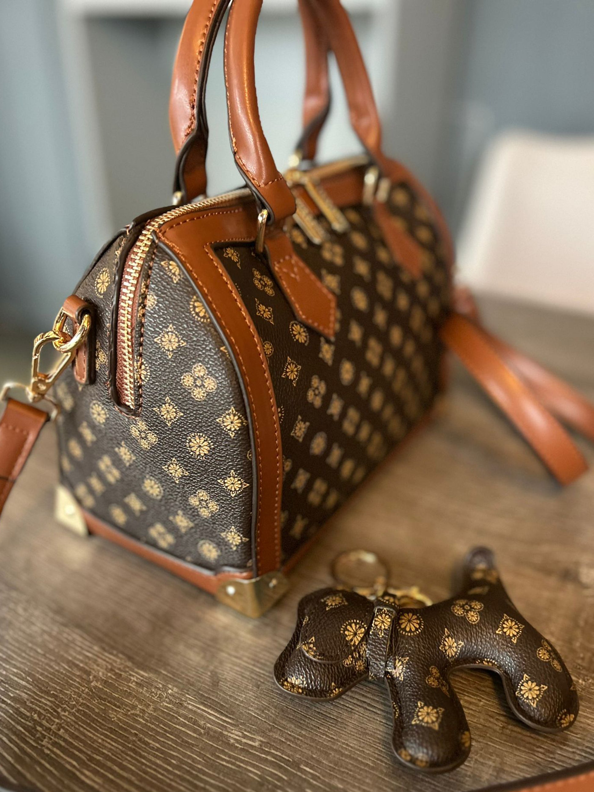 Faux Leather Handbag / Crossbody / Bowling Bag with a long detachable strap. Detachable keyring / bag charm and inside zip pocket. Approx: 23 x 16 x 13cm.