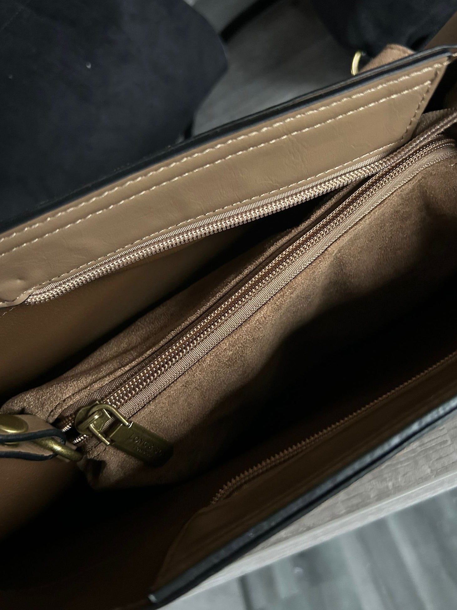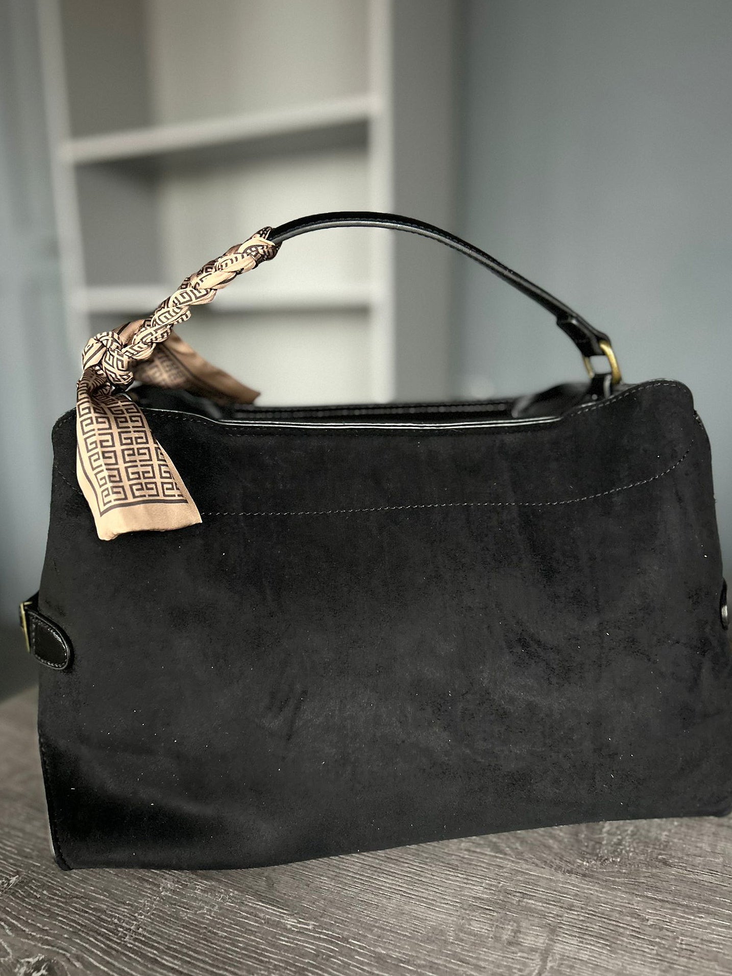 Shoulder bag with long detachable strap. Inside bag can be worn as a small crossbody bag or can be attached inside the main bag. Inside zip pocket, with scarf detail, and side buckles detail. Main bag approx: 33 x 20 x 12cm. Smaller bag approx: 25 x 15 x 10cm.