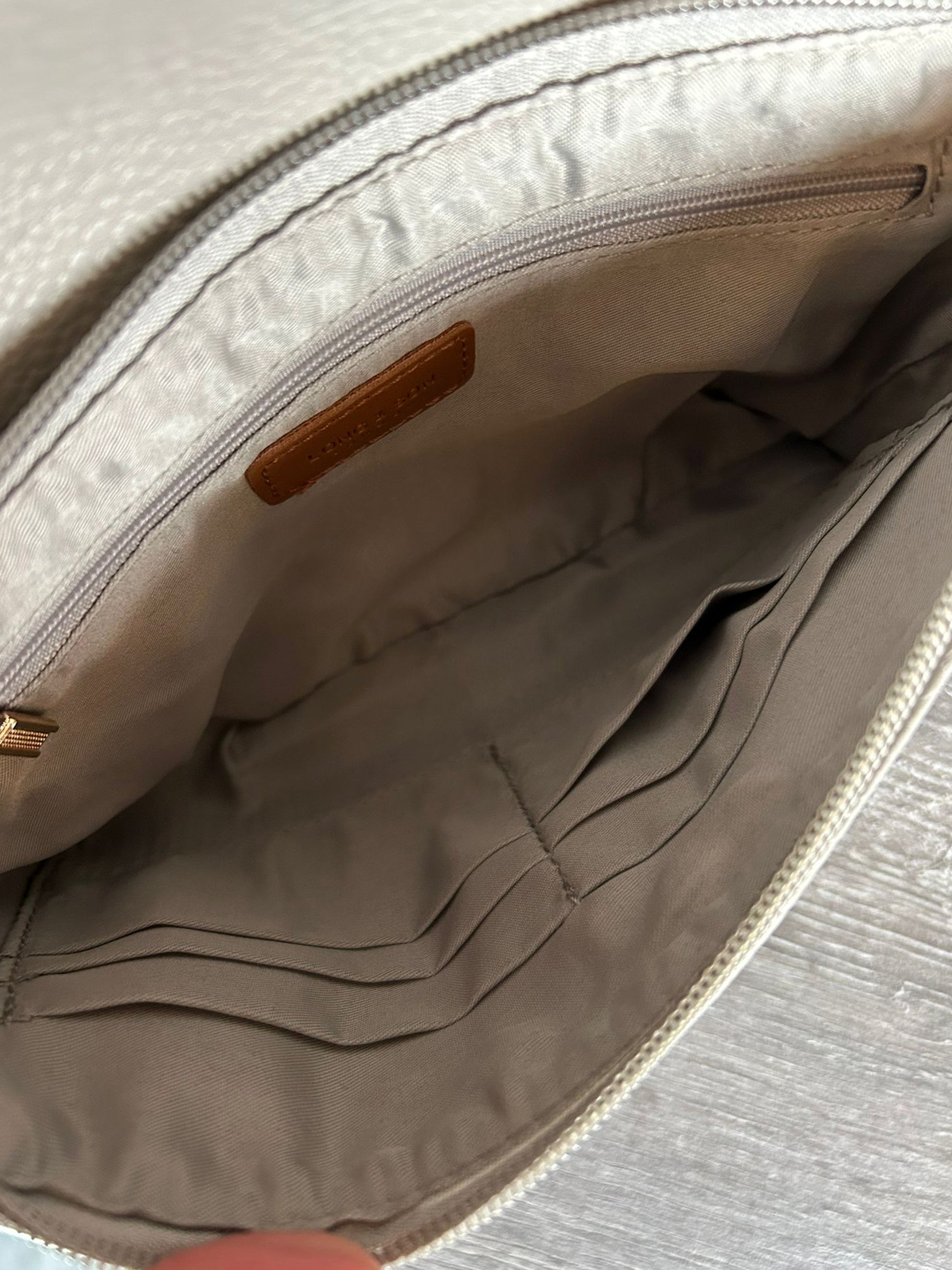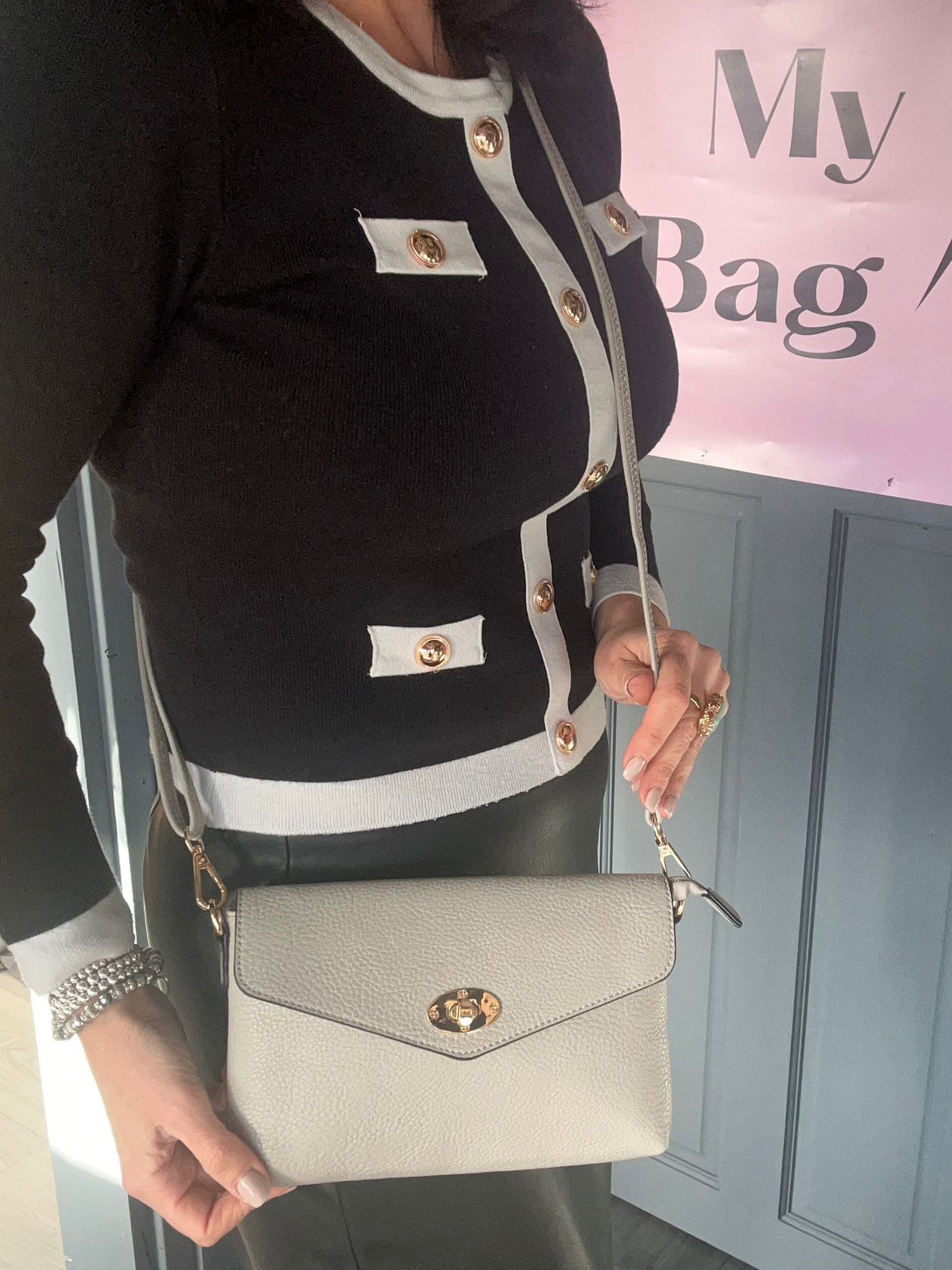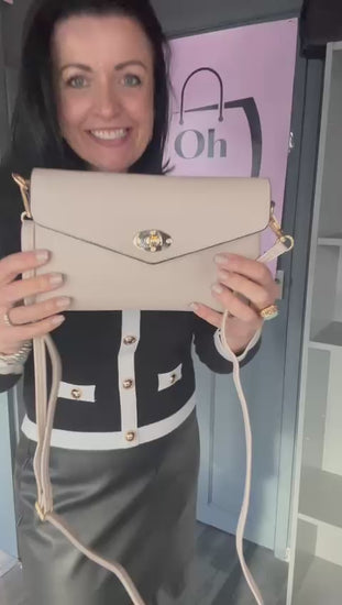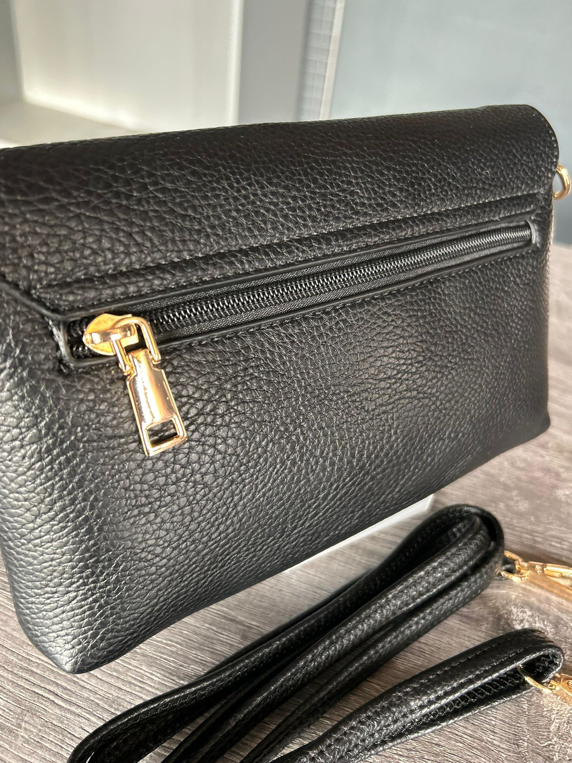 Faux leather clutch / crossbody bag. With clip fastening, zip top, inside and back zip pockets. Long detachable strap. Approx: 23 x 15cm.