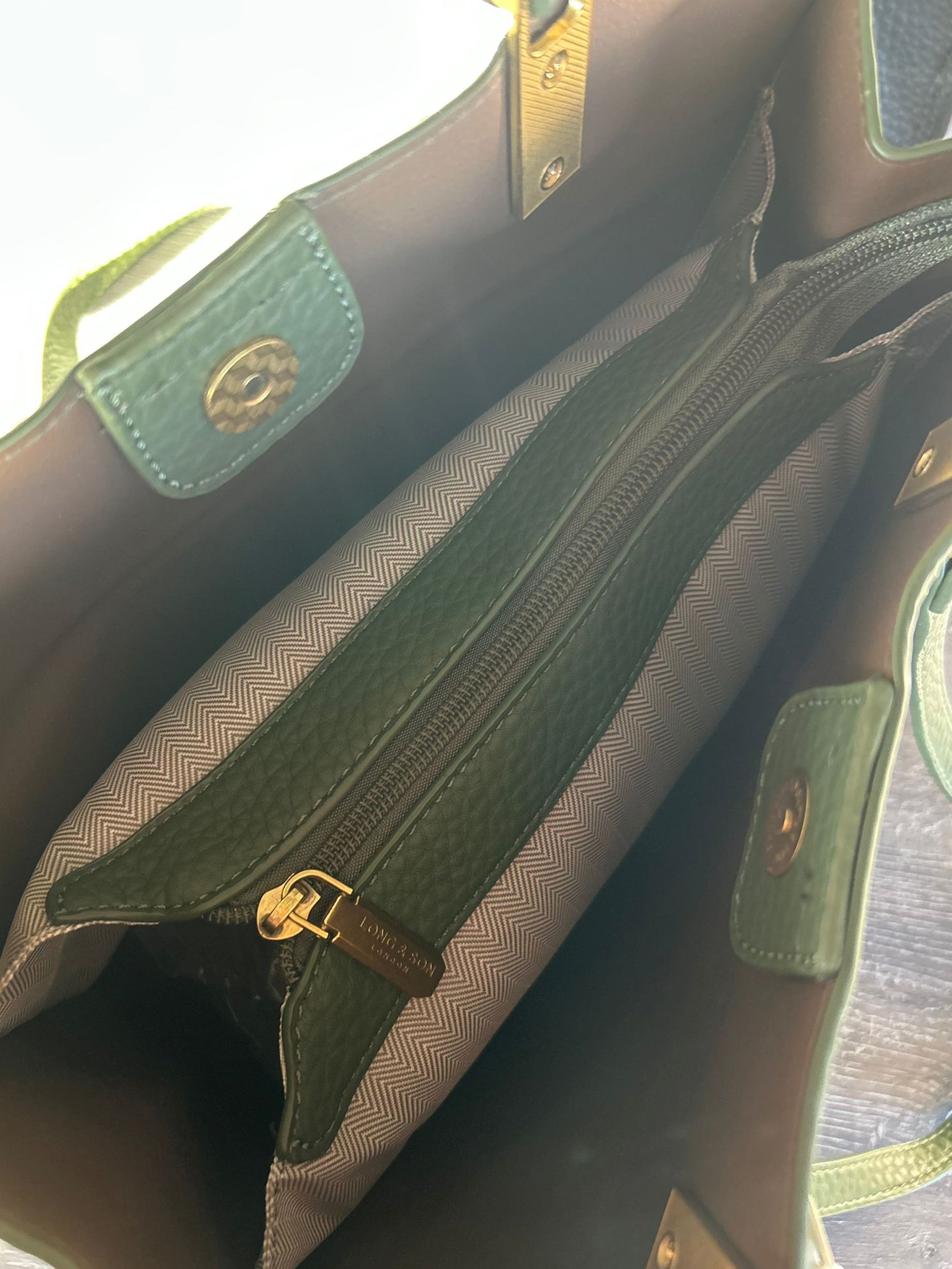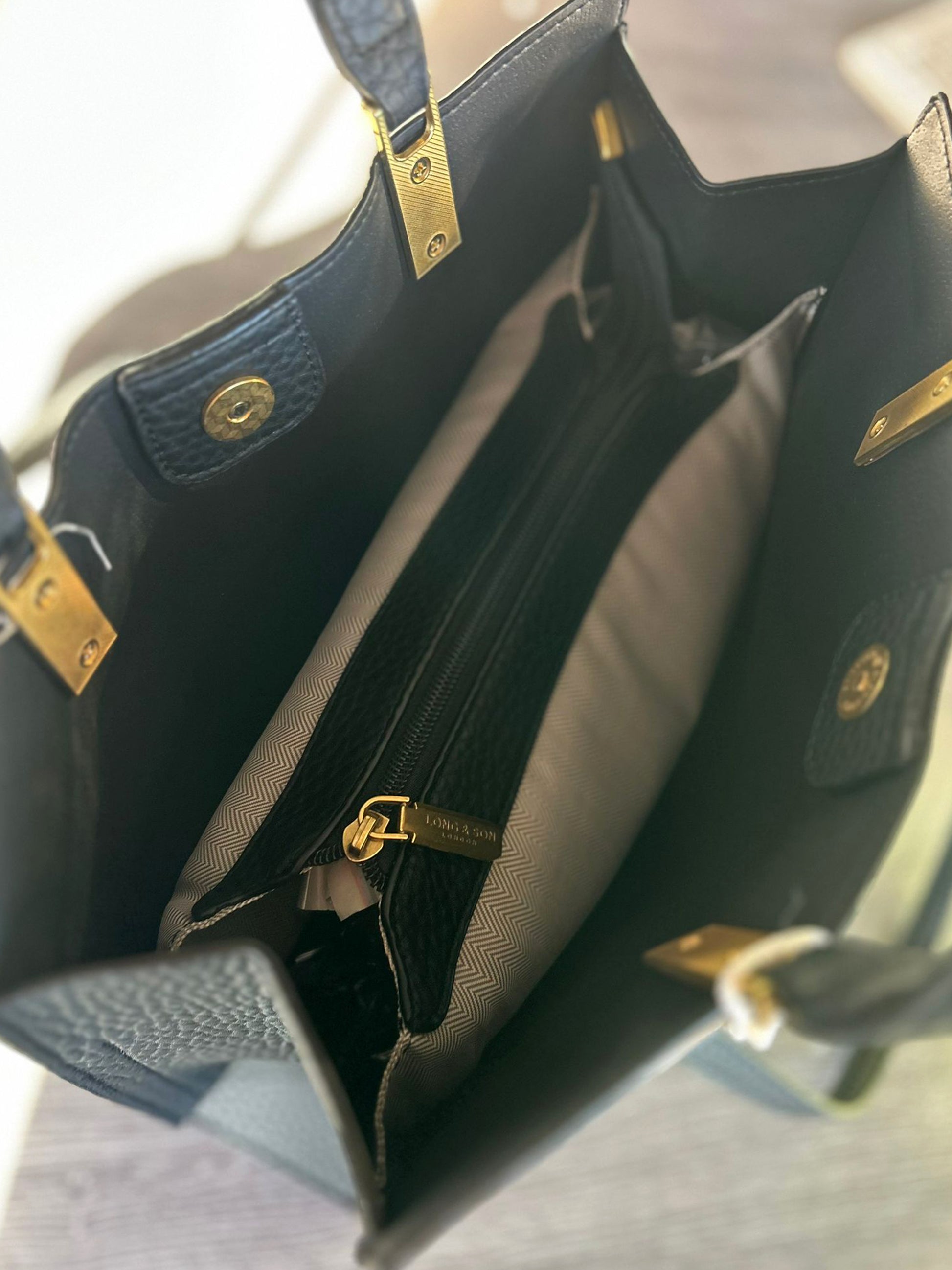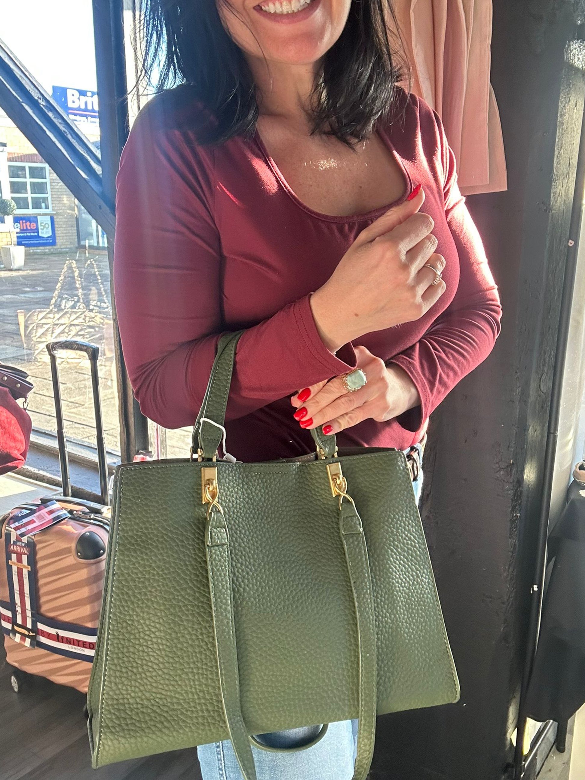 Soft faux leather shoulder bag. With grab handles and longer shoulder straps. Clip fastening plus a zip top, and inside zip pocket. Approx: 35 x 26 x 10cm.