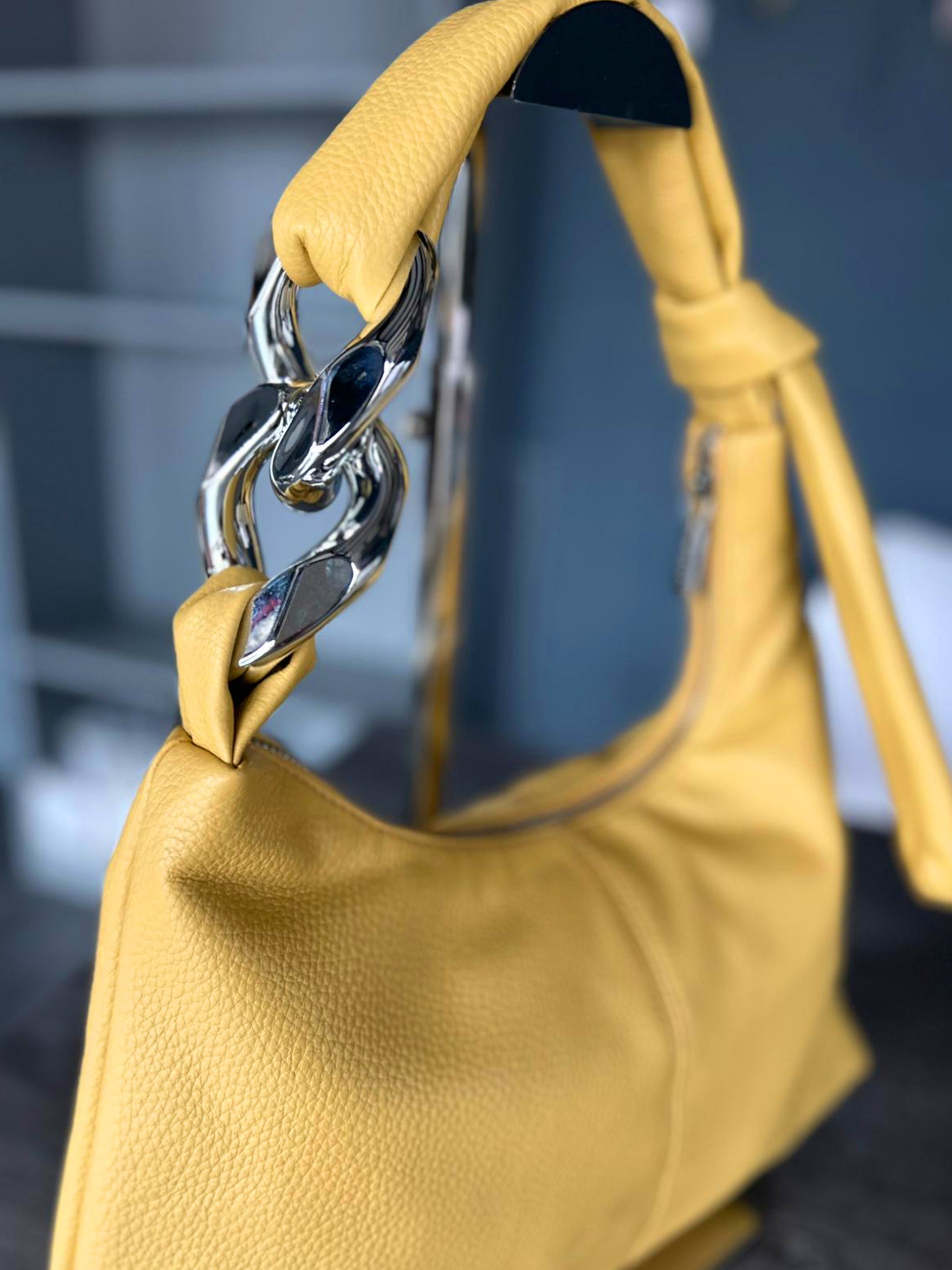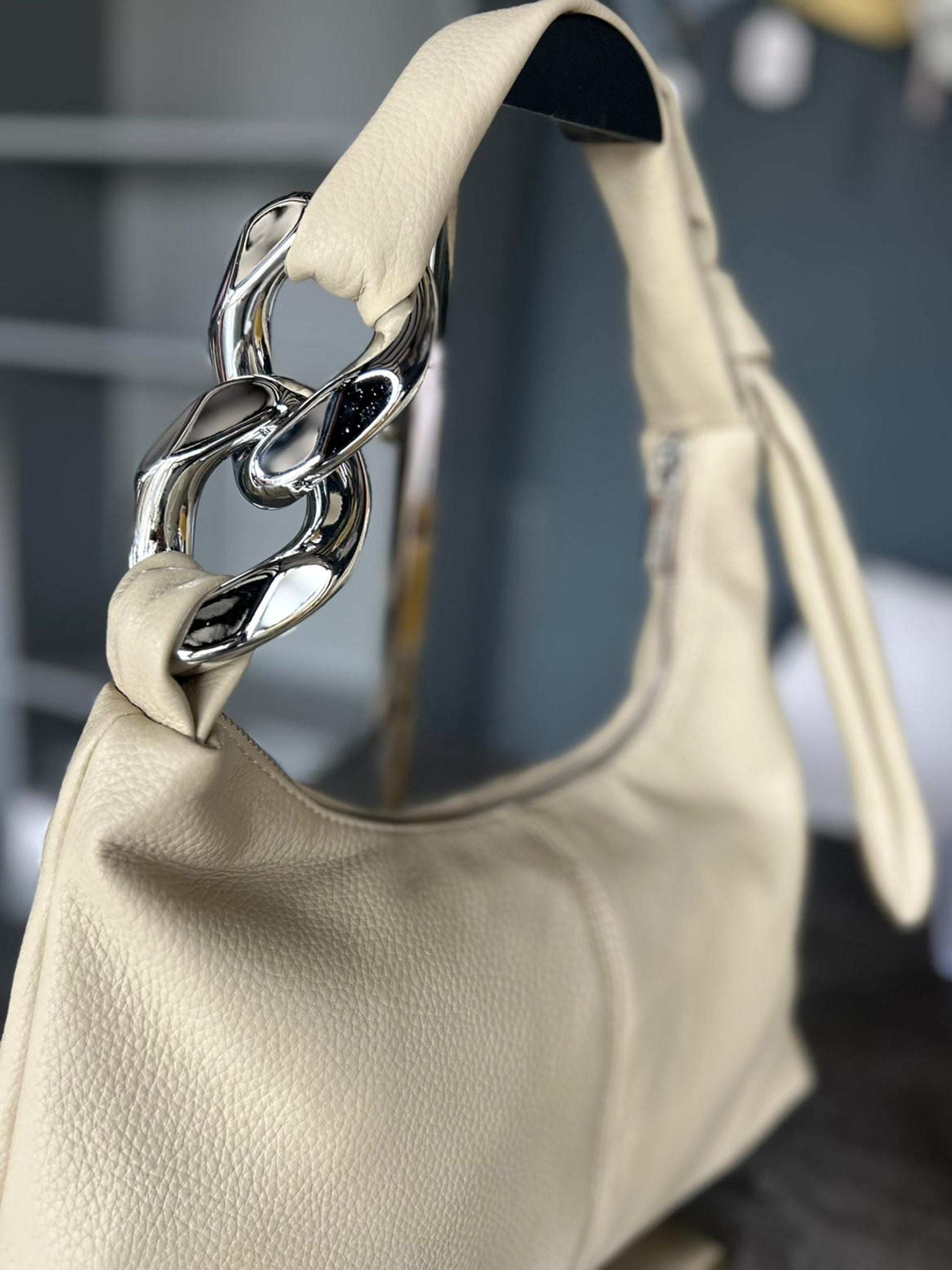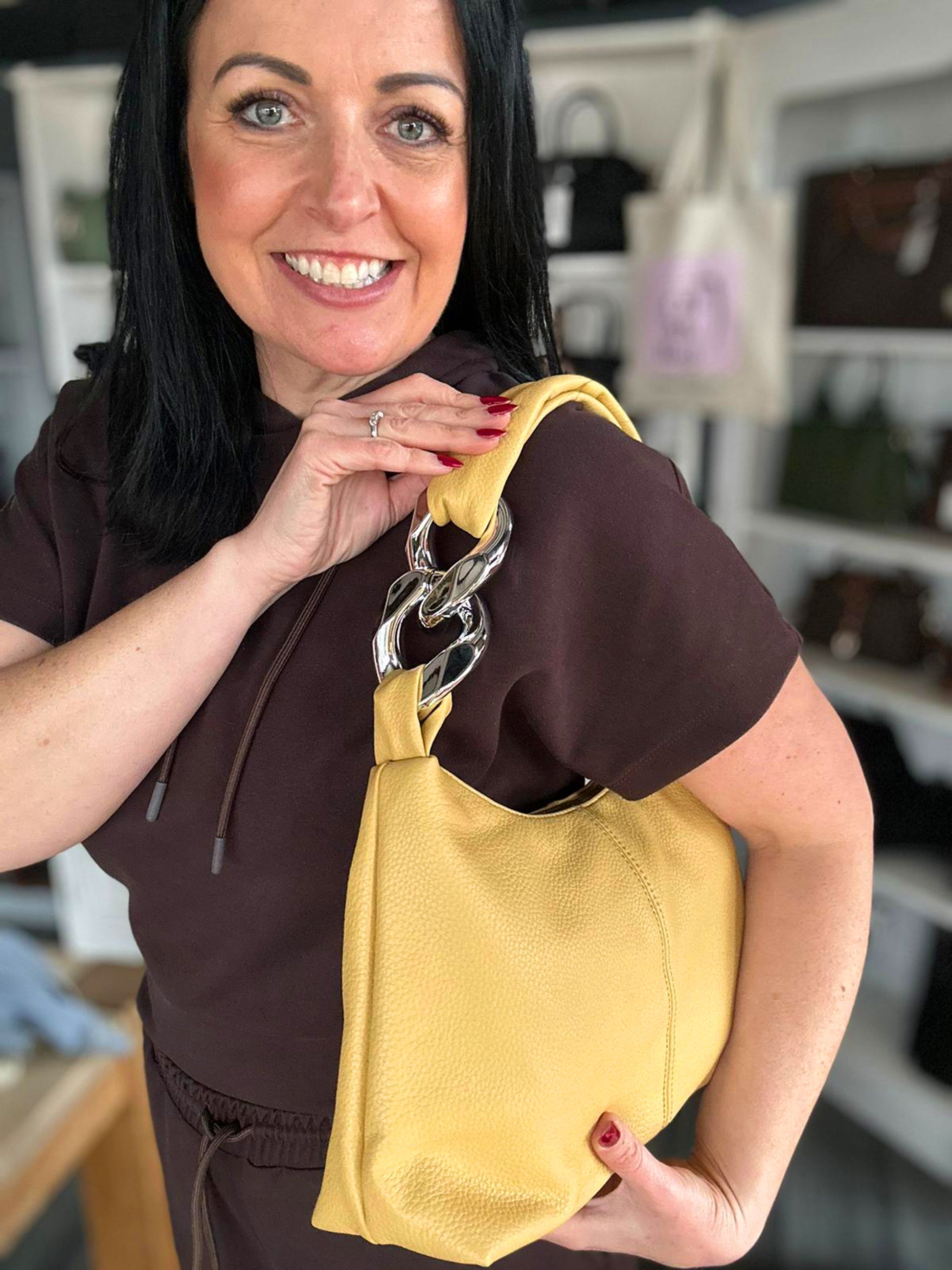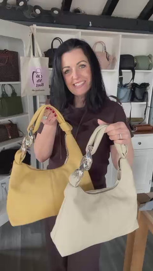 Soft faux leather shoulder bag with silver tone chain link detailing. Inside zip pocket and side section. Approx: 36 x 20 x 11cm.