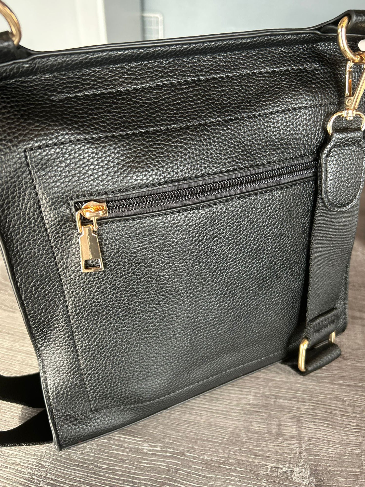 Showcasing a Gold Bee motif. Zip closure at the top. Includes inside and back zip pockets. Features a long printed magnetic clip for fastening. Comes with a long adjustable strap. Dimensions are approximately 24 x 23 x 8cm.