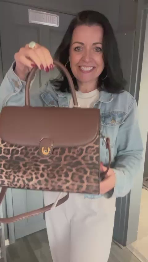 Leah - chocolate brown leopard print bag, with a twist clip fastening. Zip top, with back and inside zip pockets. Features a long adjustable, detachable strap. Approx 28 x 21 x 12cm.