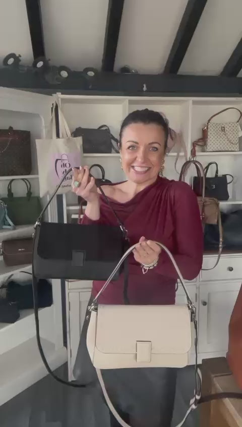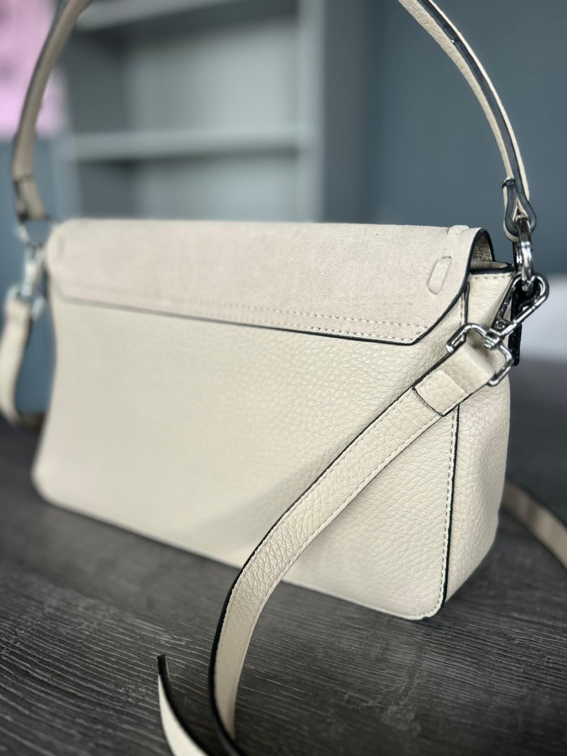 Faux leather shoulder bag, with faux suede effect. Magnetic clasp, zip top with inside zip pockets. Shoulder strap plus a long detachable crossbody strap. Approx: 28 x 18 x 10cm.