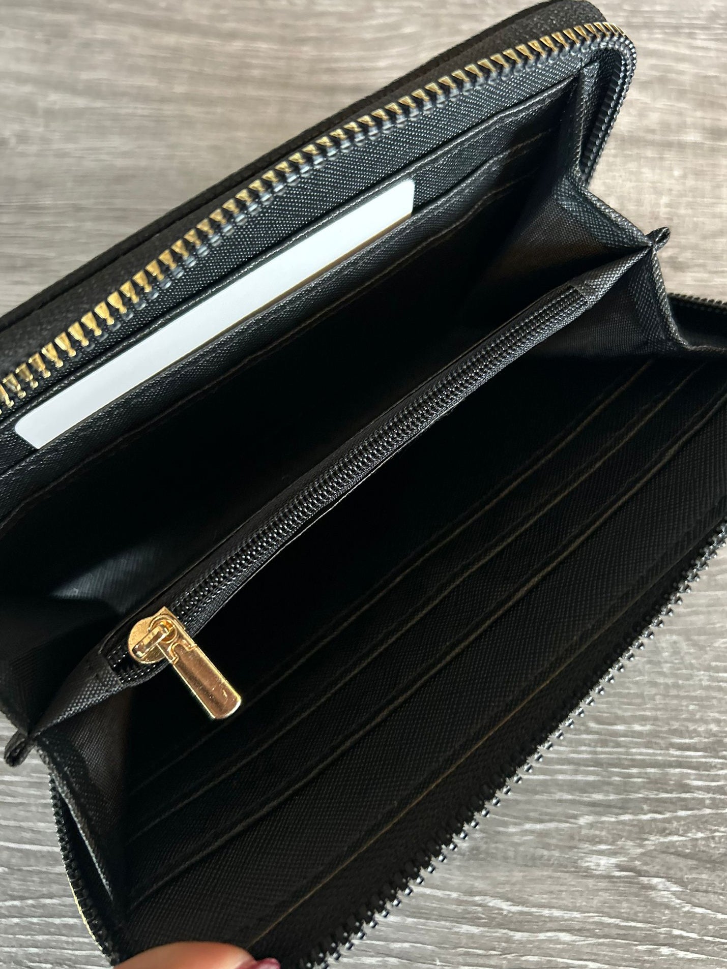Faux leather slim purse. Zip around, with zip coin section. Notes section and plenty of card sections. Approx 17 x 10 x 2cm.